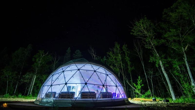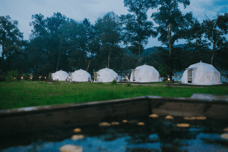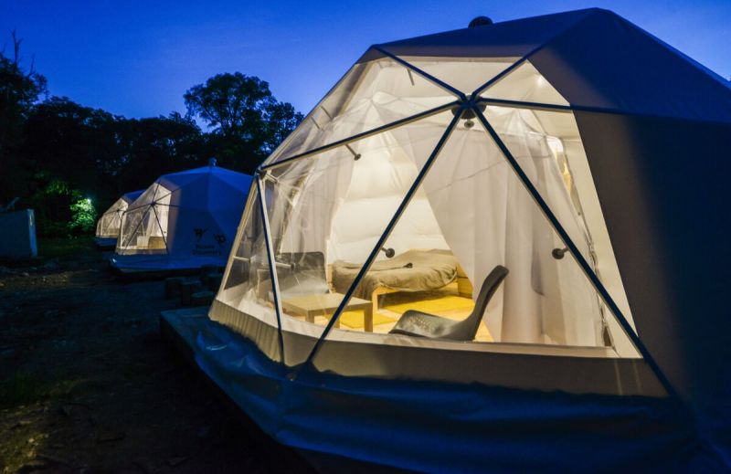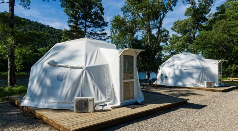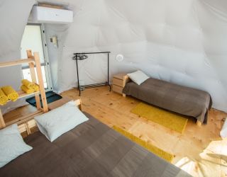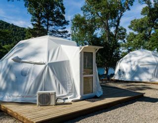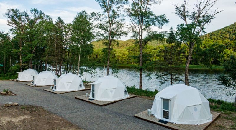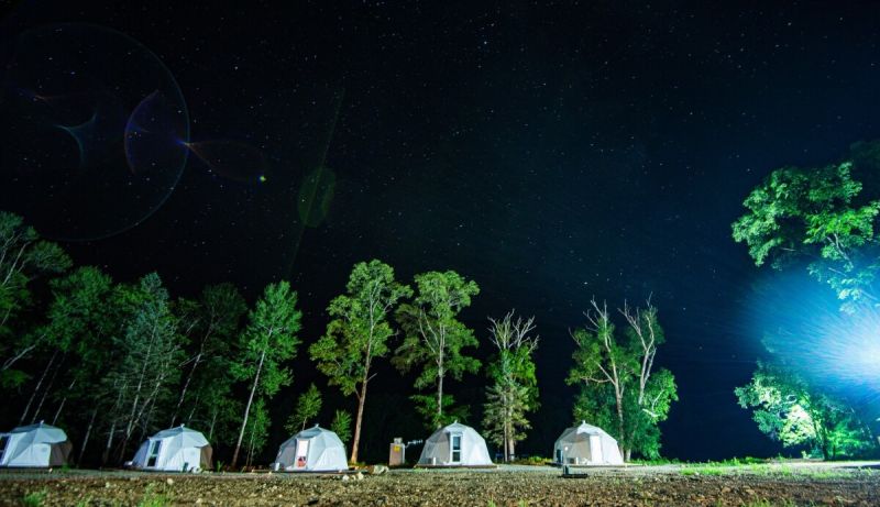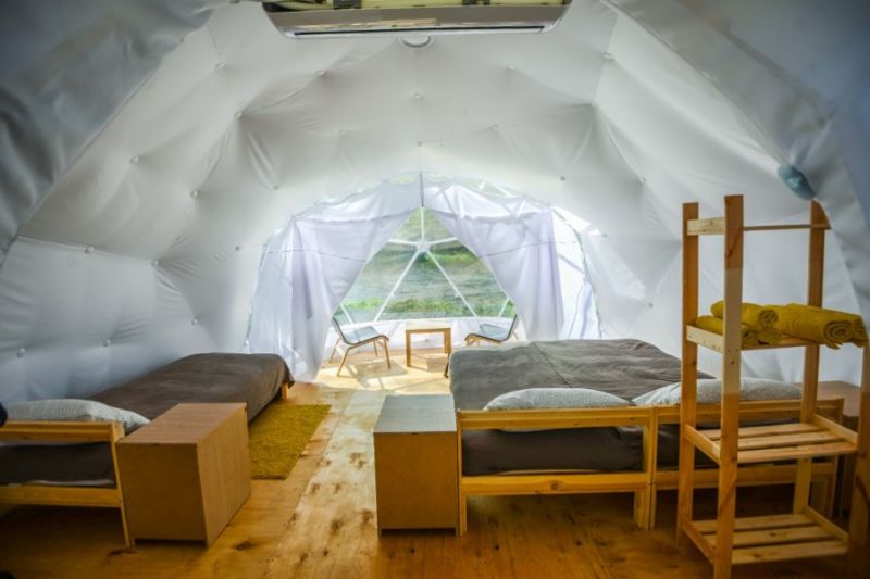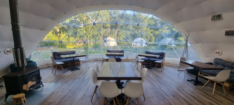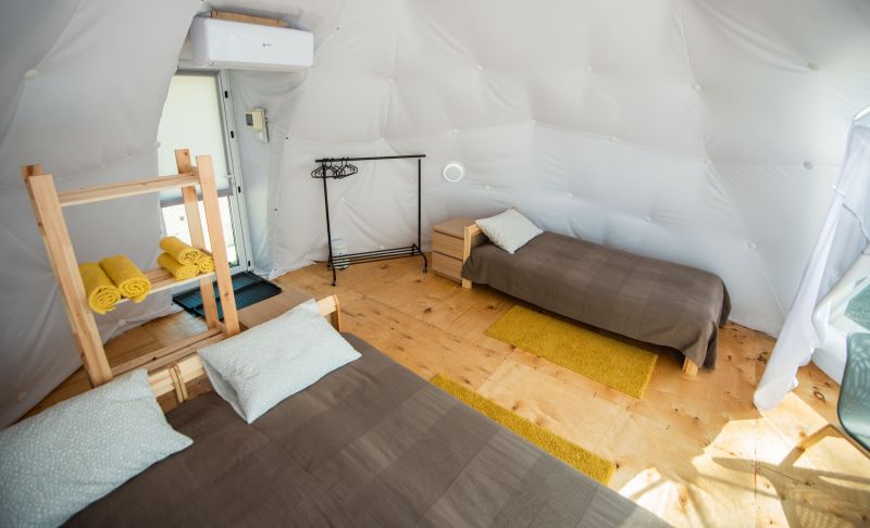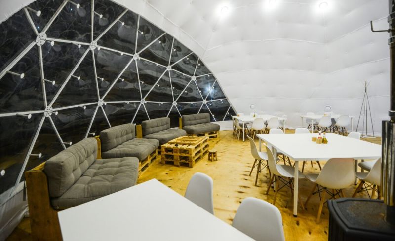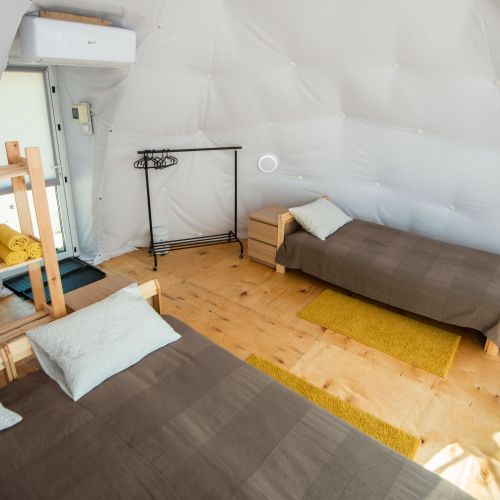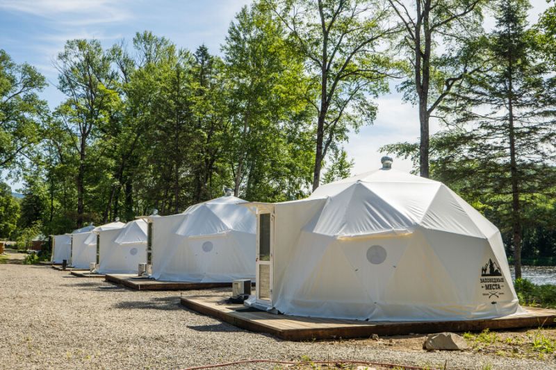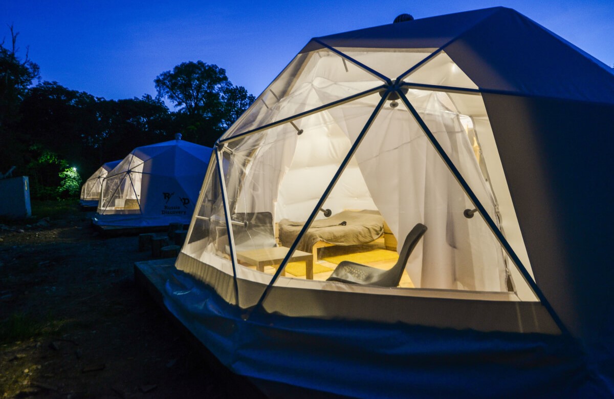 Для проживания предлагается восемь уютных купольных шатров круглогодичного действия, расположенных в две линии. Летом в шатрах не жарко – установлены кондиционеры, а зимой не холодно – имеются обогреватели. Шатры оборудованы модульными кроватями, местами для хранения вещей, зоной отдыха со столиком у панорамного окна. Санузел и душевые располагаются в отдельном здании на территории.