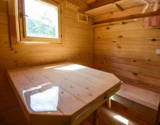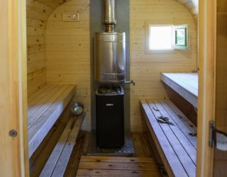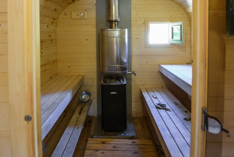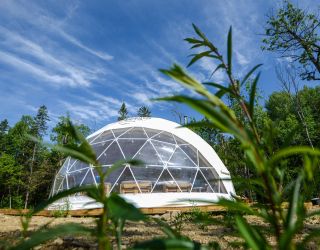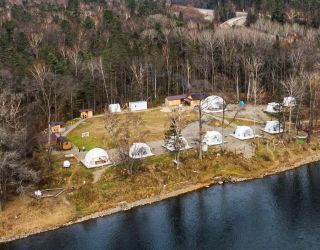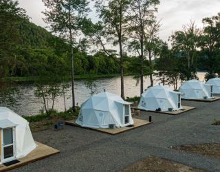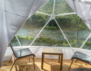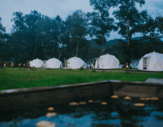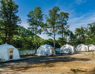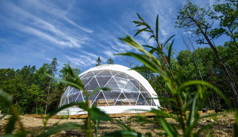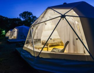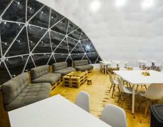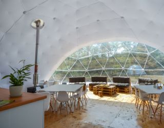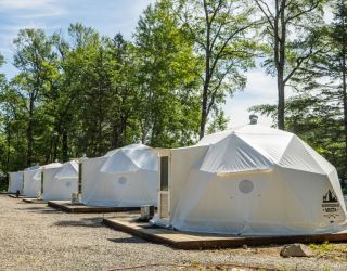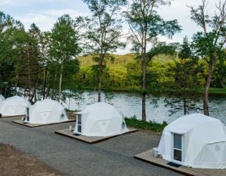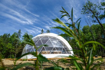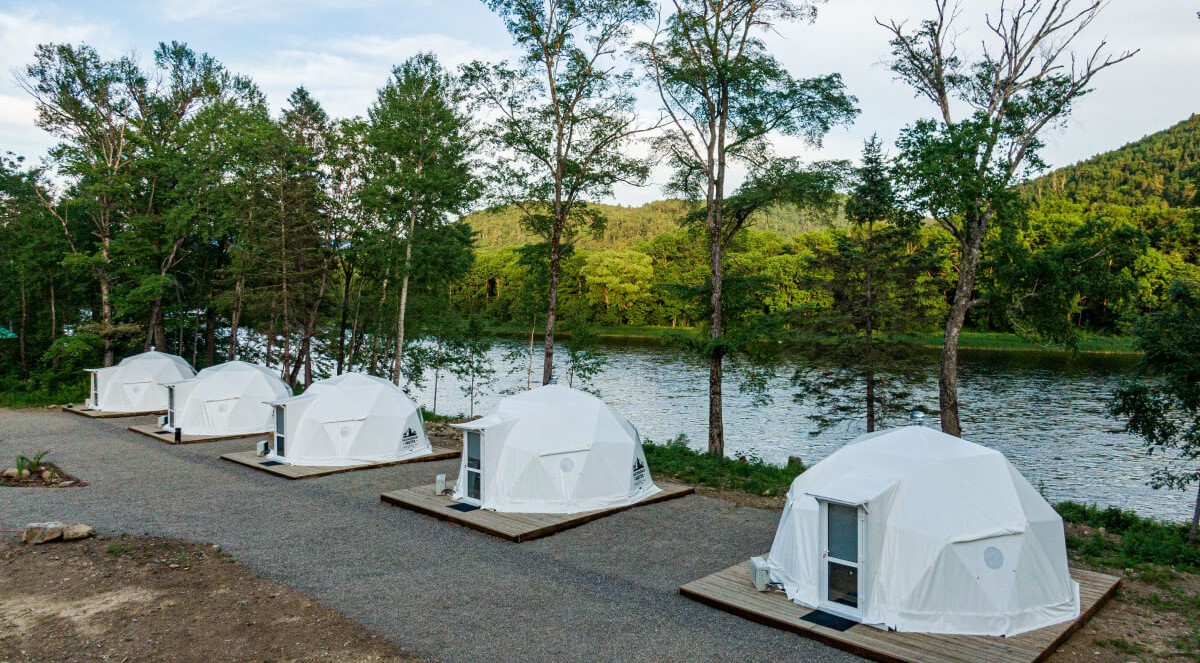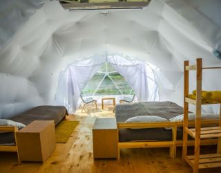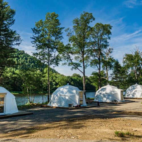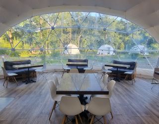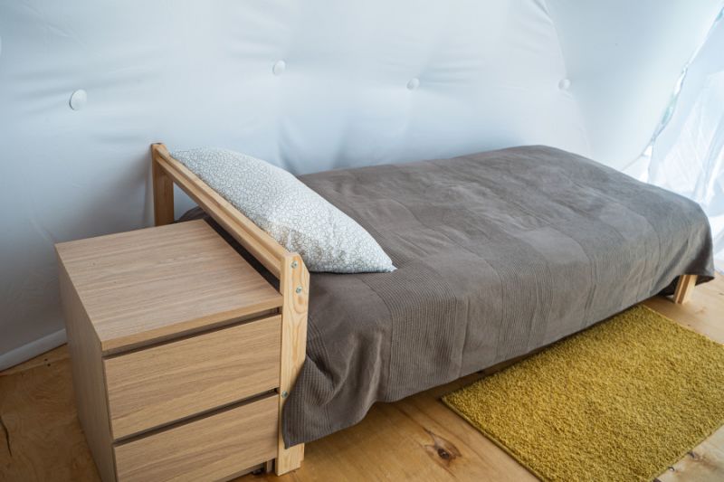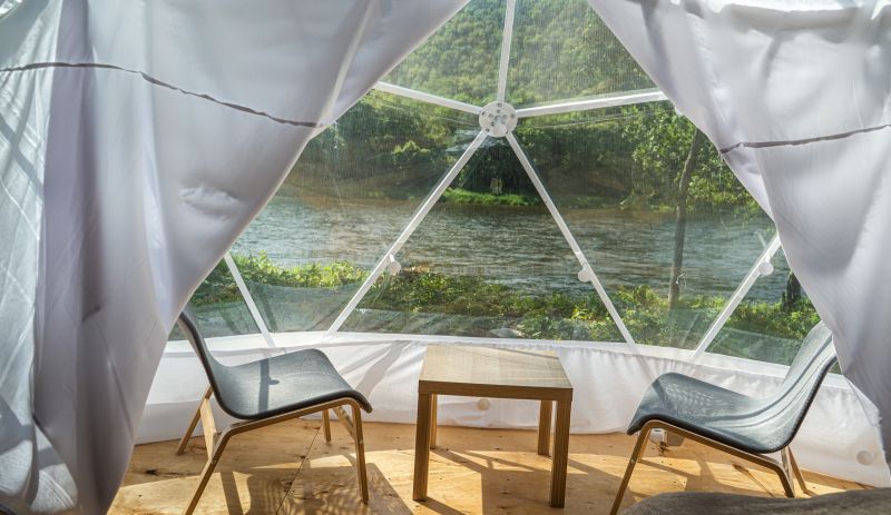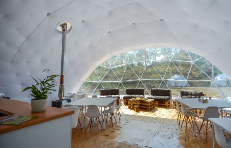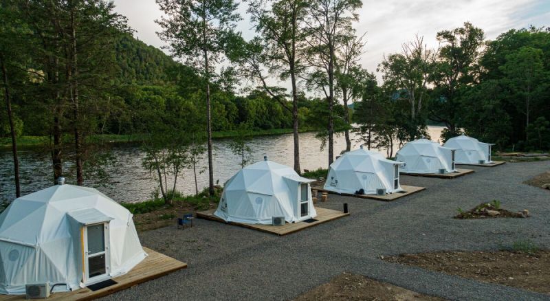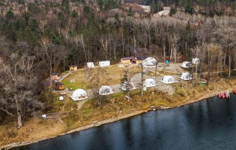 Для проживания предлагается восемь уютных купольных шатров круглогодичного действия, расположенных в две линии. Летом в шатрах не жарко – установлены кондиционеры, а зимой не холодно – имеются обогреватели. Шатры оборудованы модульными кроватями, местами для хранения вещей, зоной отдыха со столиком у панорамного окна. Санузел и душевые располагаются в отдельном здании на территории.
